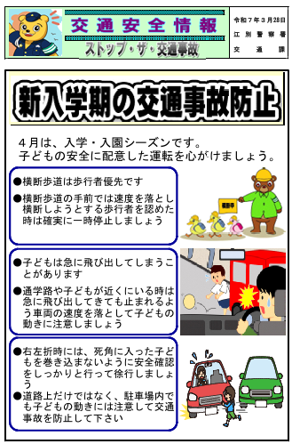 4月は、入学・入園シーズンです。子どもの安全に配意した運転を心がけましょう。